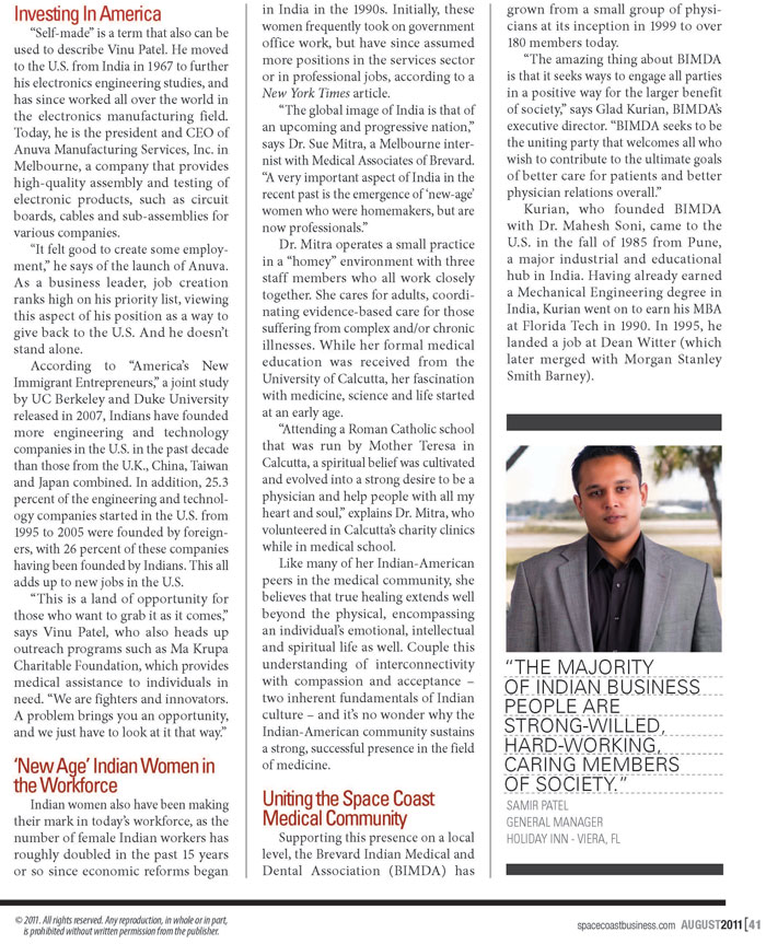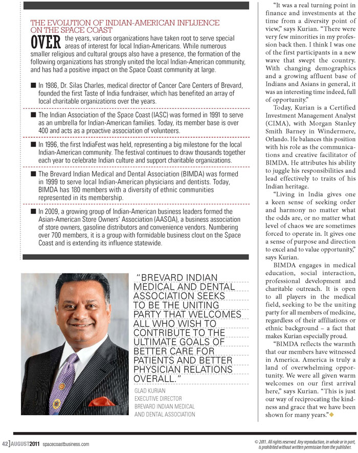 An informal gathering of doctors of Indian descent has grown into a powerful force in the local health care community now focused on education, community support and charitable giving. The Brevard Indo-American Medical and Dental Association (BIMDA) was formed in 1996 by pediatrician Dr. Mahesh Soni and Glad Kurian, a senior consultant at Morgan Stanley Smith Barney in Windermere, Orlando. “When we first started, we held five small-scale meetings a year,” explains Kurian. “The group quickly went from a fledgling outfit to the organizer of major medical conferences. It all happened by chance and very rapidly.” Kurian works with many groups in Florida, including the Central Florida Association of Physicians from the Indian Subcontinent Inc. (CAPI), the Treasure Coast Indo-American Physician Society (TIPS), the Indian Physicians of South Florida Inc. (IPOF), Indo-American Medical Association of NE Florida (IAMA) and the national group, AAPI - American Association of Physicians of Indian Origin. He is the strategic thinker and creative force behind many BIMDA initiatives, including its successful annual medical expo. “As an all volunteer group, BIMDA has made remarkable strides. Most importantly, we are proud of our doctors,” he says. LEARNING FROM EACH OTHER