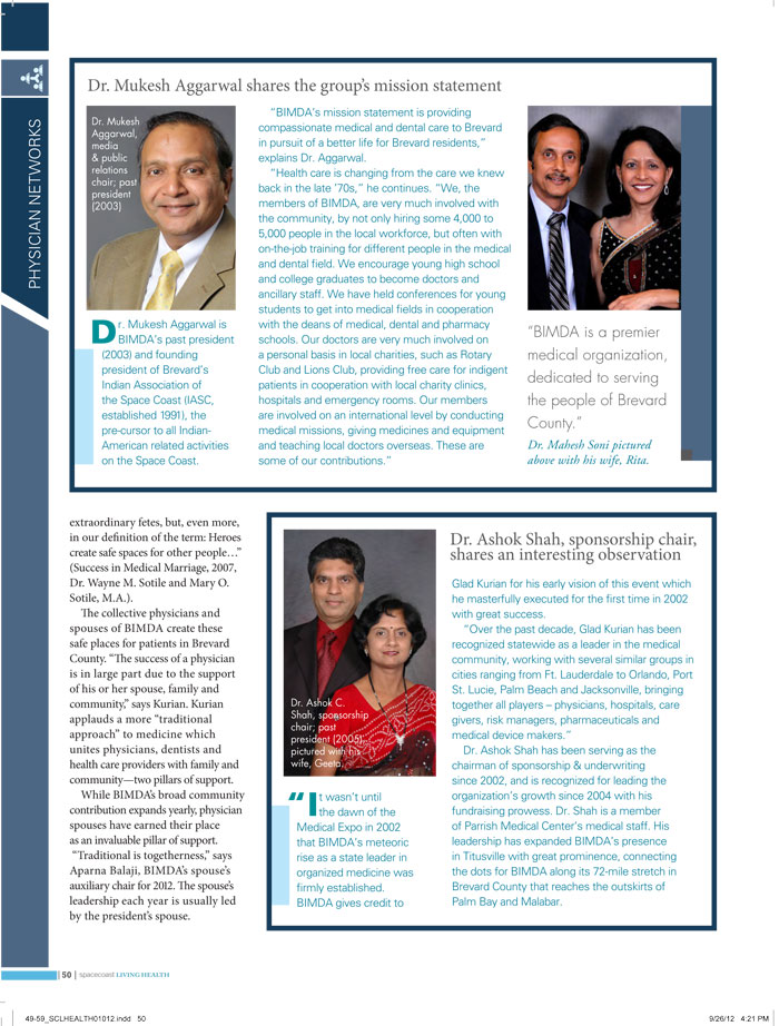 Brevard Indo-American Medical and Dental Association (BIMDA). What began informally in 1996 by Dr. Mahesh Soni, a pediatrician, and Glad Kurian, a senior consultant at Morgan Stanley Smith Barney in Windermere, Orlando, as a gathering of Indian-American doctors has grown to a 180-member force moving forward with education, community support and charitable giving.