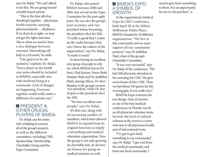 “We have a chance to network, exchange ideas, learn from CME and at the same time contribute to charities. This is how we help the community,” says Dr. Gobivenkata Balaji, president-elect of BIMDA. “Health care professionals work long hours and don’t have time to network, but BIMDA provides that opportunity. My goal is that every health care professional participates and interfaces with each other as an integrated health care team which will, in the end, help the patient. For 2012 we have plans to have more health care professionals involved and provide excellent CME programs. We are blessed to have three major health systems being part of our efforts.”